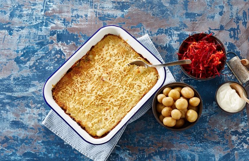 En litt annerledes grateng, med rød fisk, grønnsaker og uten makaroni.