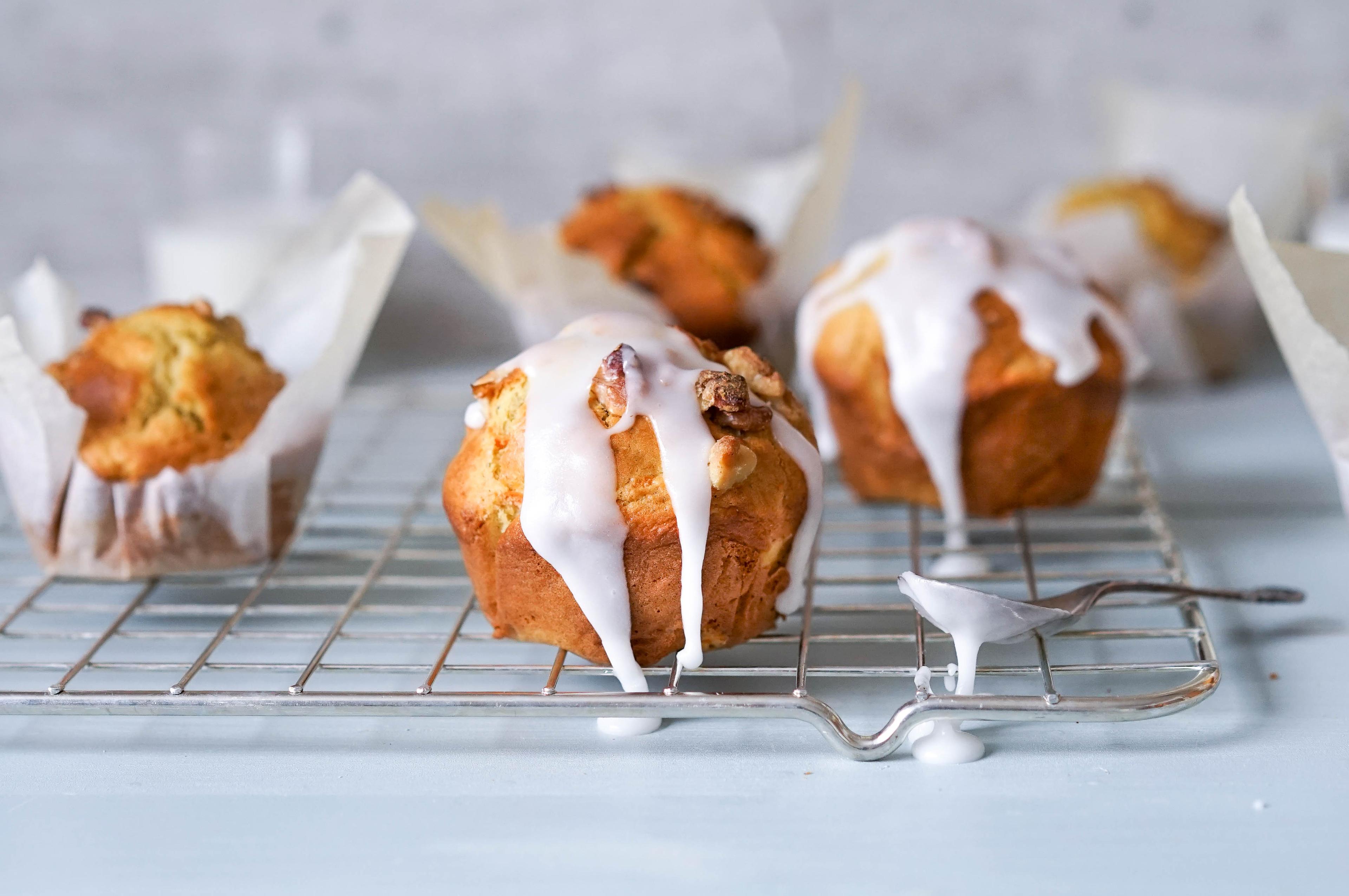 - Fordel deigen i mellomstore muffinsformer og dryss over finhakkede valnøtter