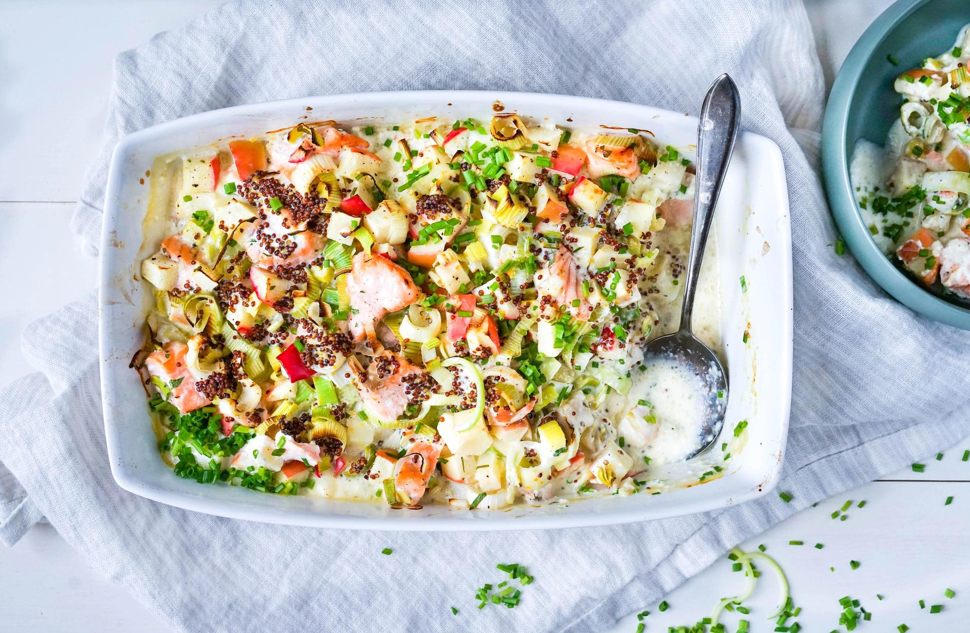 - Smak til med salt, pepper, bladpersille og sitronsaft, og legg alt i en smurt ildfast form.