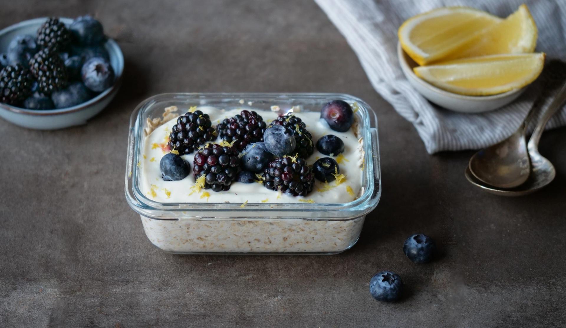 - Rør sammen havregryn, melk og kvarg i et glass eller en annen beholder med lokk. Rør deretter inn revet sitronskall.