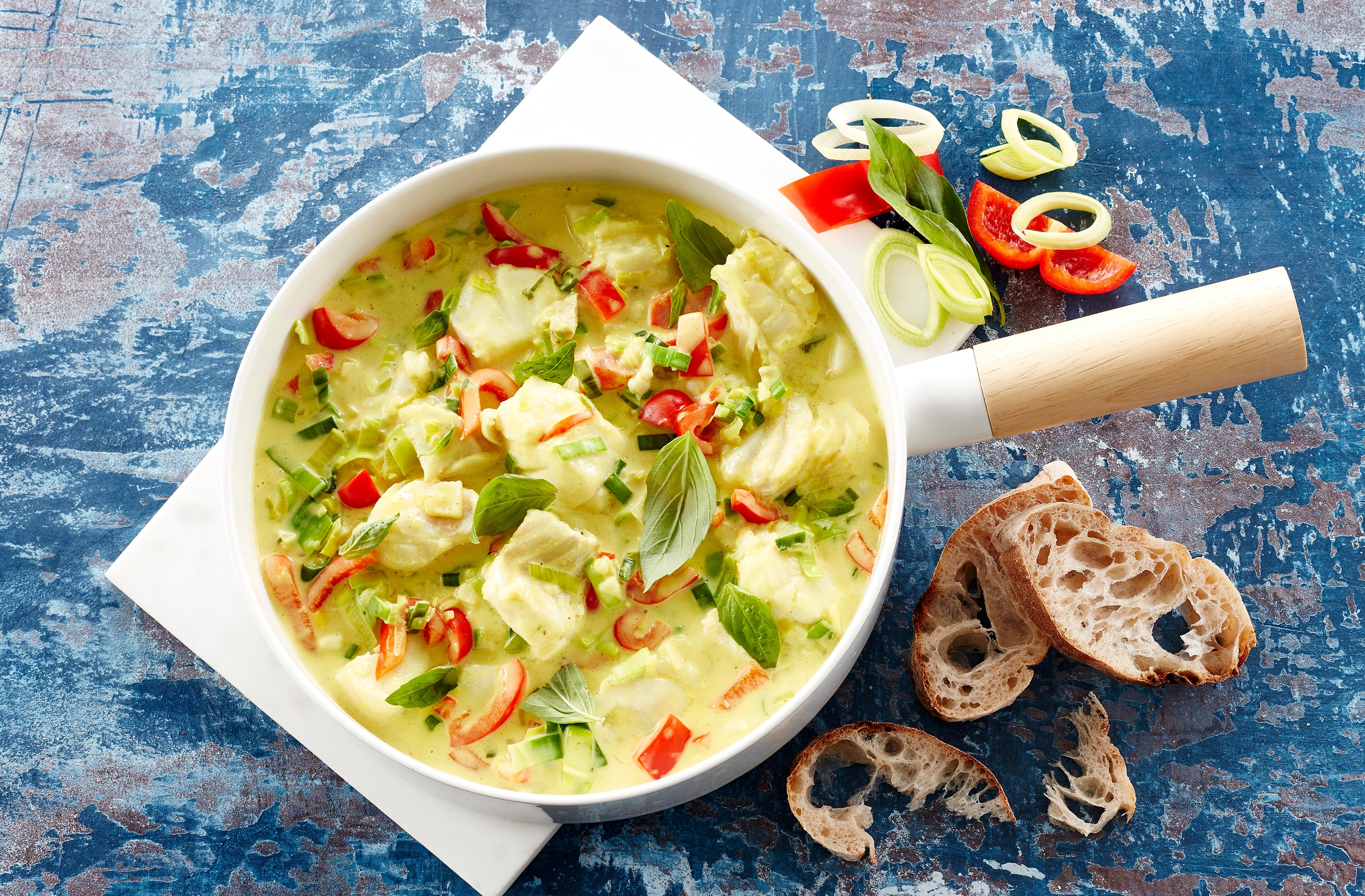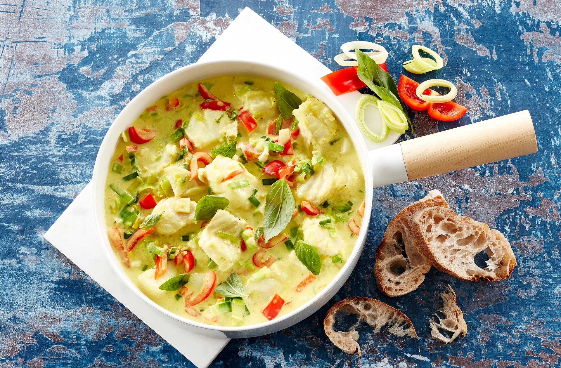 - Legg fiskebitene og paprikaen i gryten og la alt trekke i ca 10 minutter, til fisken er ferdig kokt.