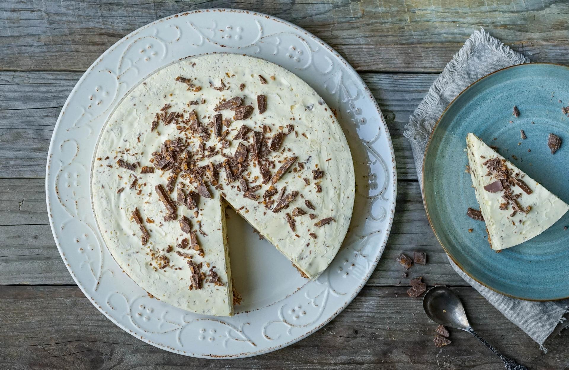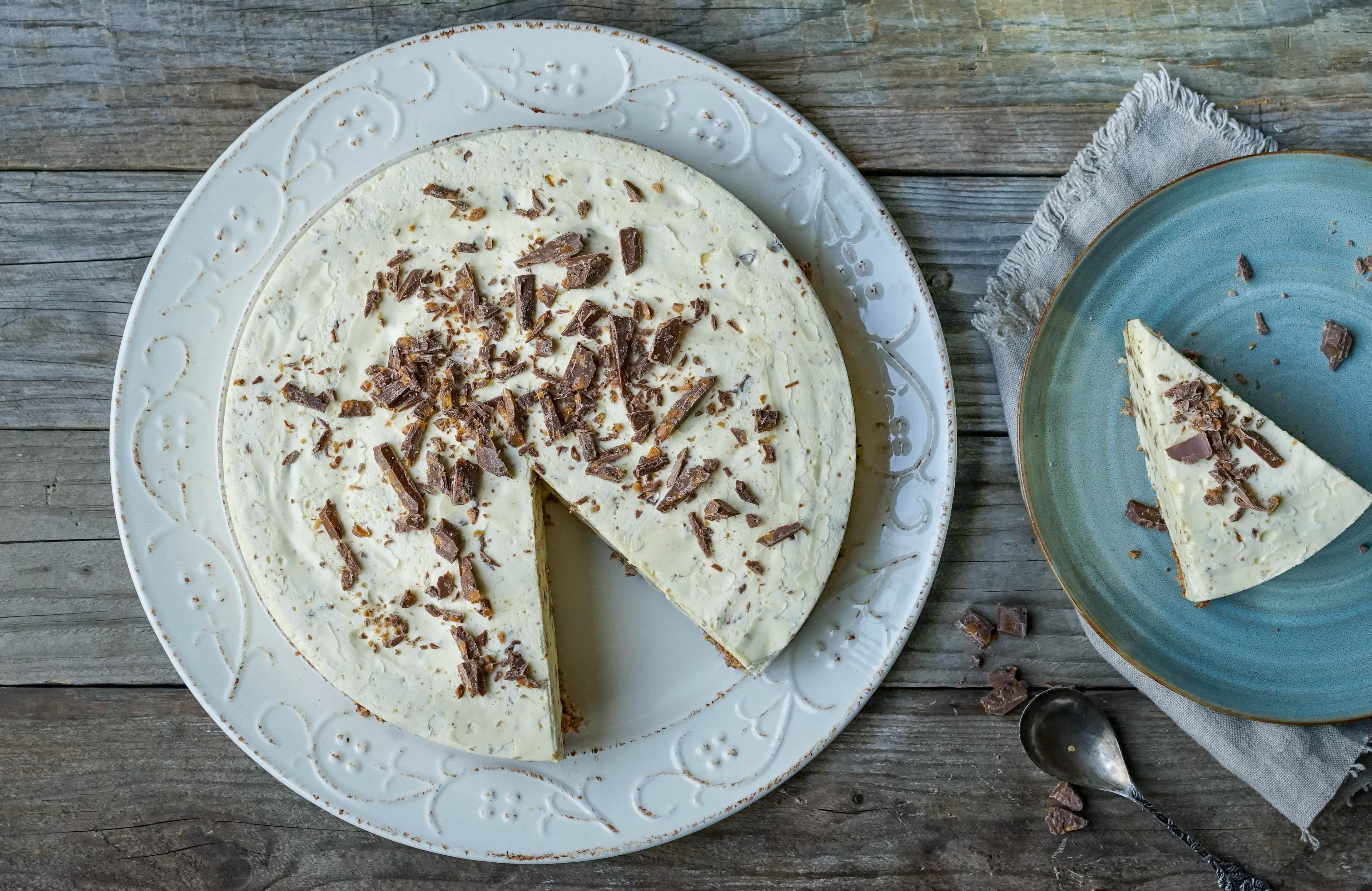 - Før servering kan du anrette kaken på fat mens den er dypfryst og la den stå i ca 1/2 til 1 time i kjøleskap. Pynt med krem og finhakket sjokolade.