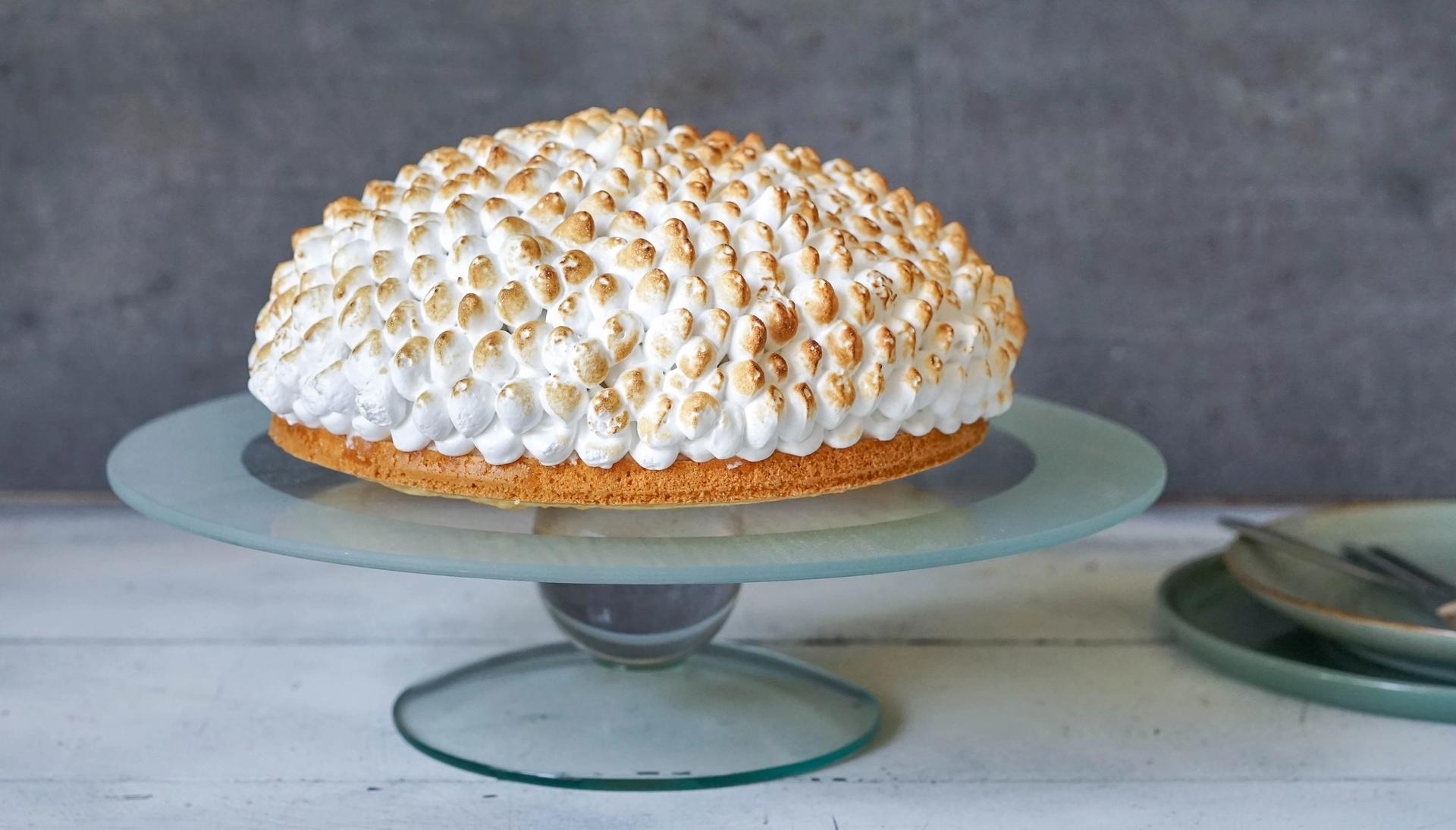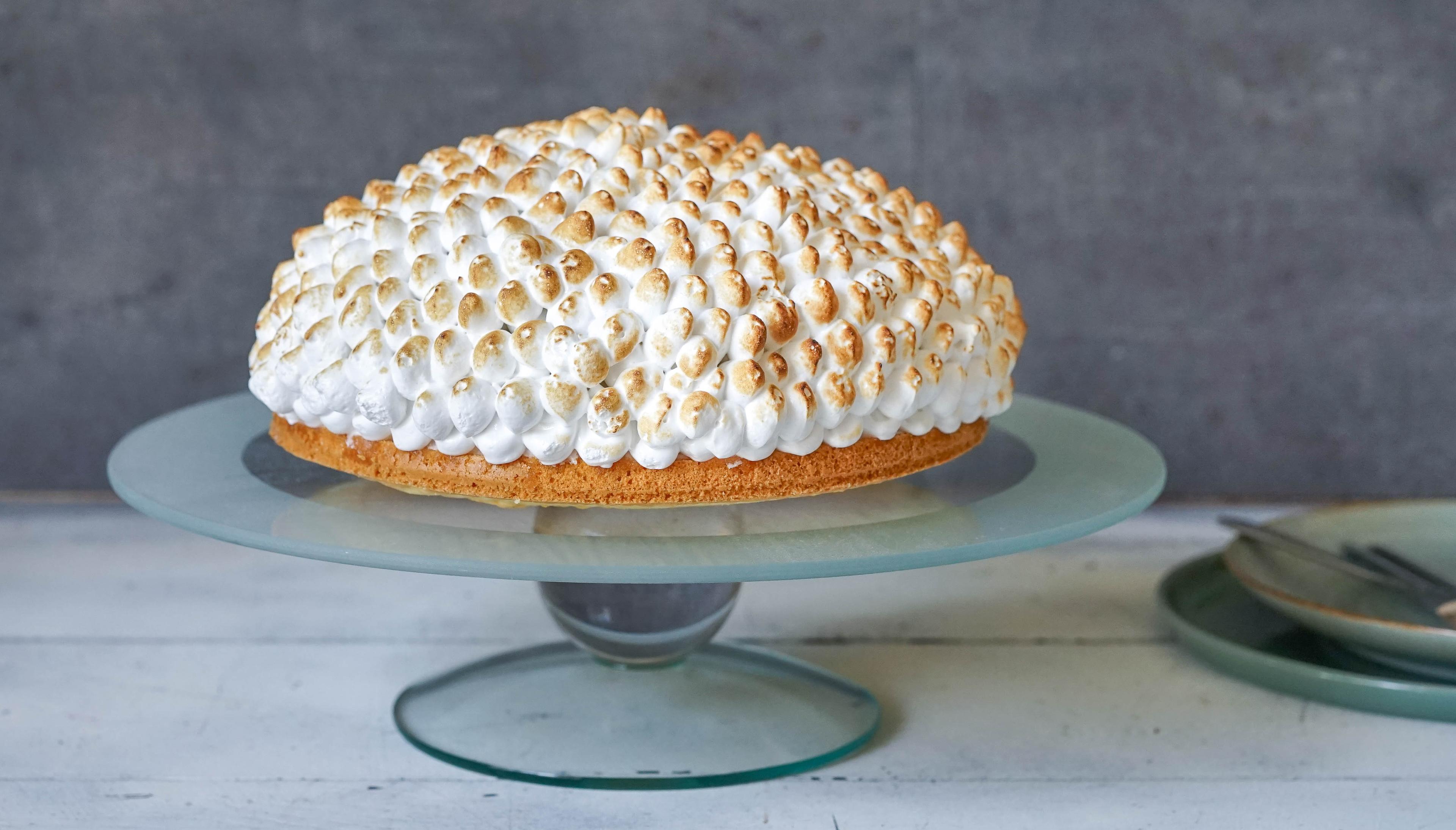 - Legg halvparten av bærene på sukkerbrødbunnen. Fordel skiver av iskrem over og dekk hele kaken godt med marengsen, også ned på sidene. Hvis du ikke skal steke kaken med en gang, kan den oppbevares i fryseren i mellomtiden.