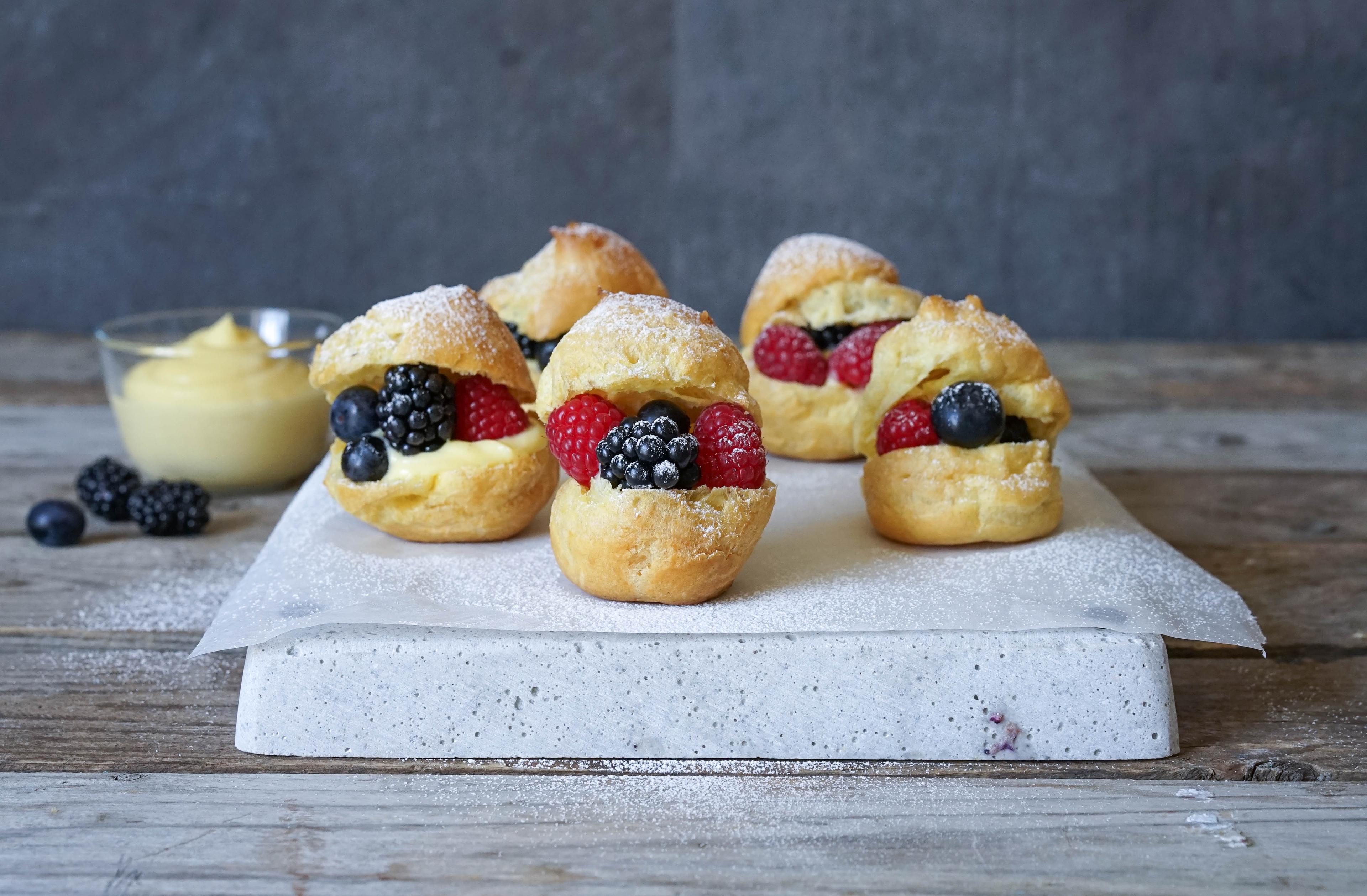 - Pisk sammen vaniljekrem med pisket krem, og fyll vannbakkelsene med krem og bær.