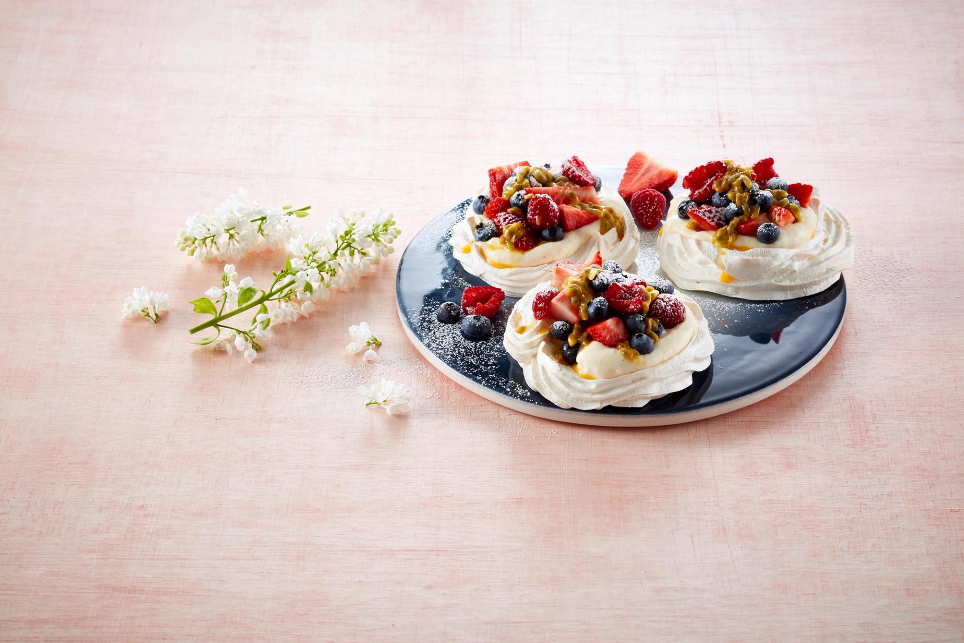 Server noen lekre små porsjonspavlova som dessert eller på kakebordet. Smakfullt og enkelt.