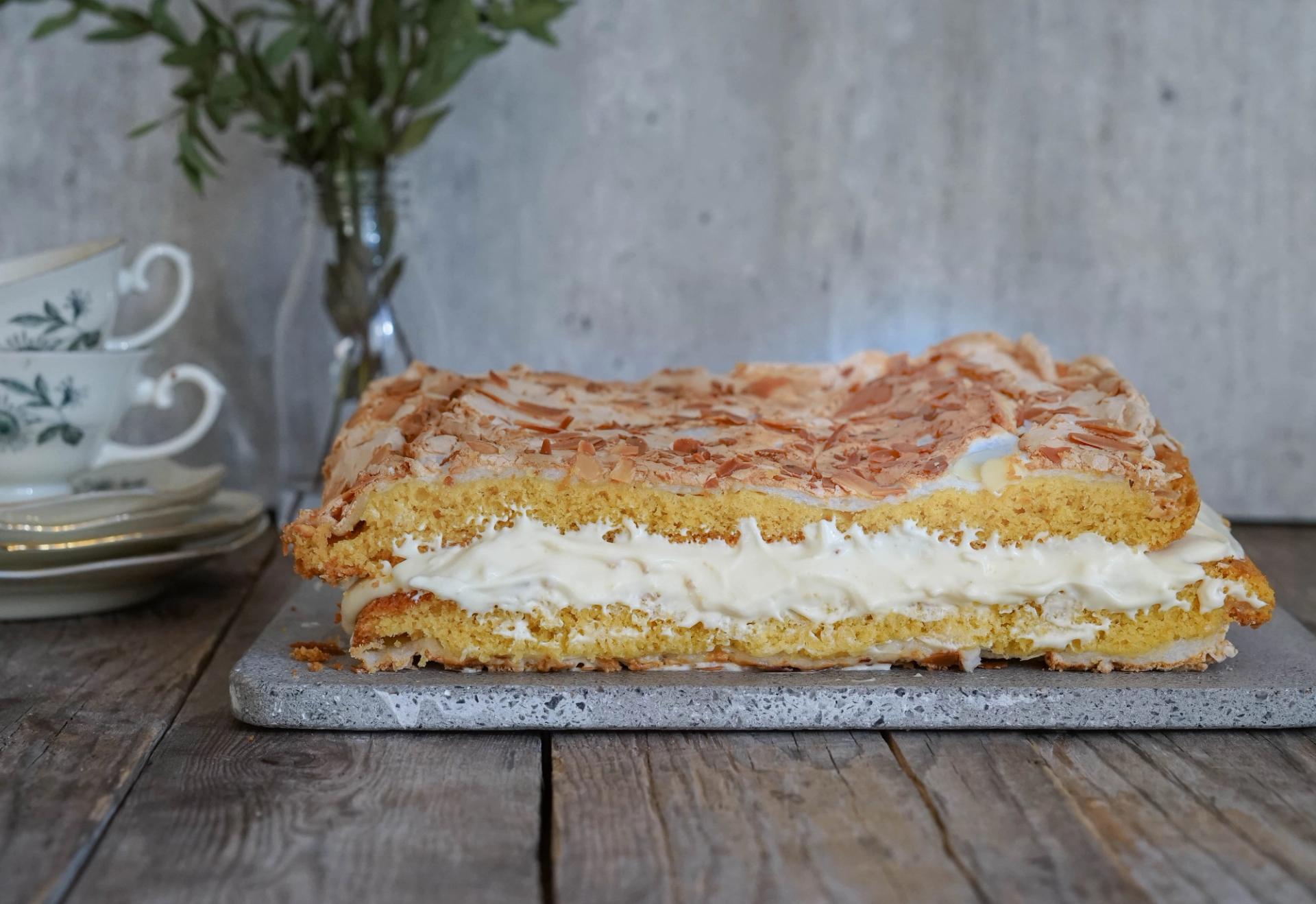 - Fordel massen over deigen og dryss på mandlene. Stek kaken/kakene midt i ovnen i 20-25 minutter og avkjøl den/de.