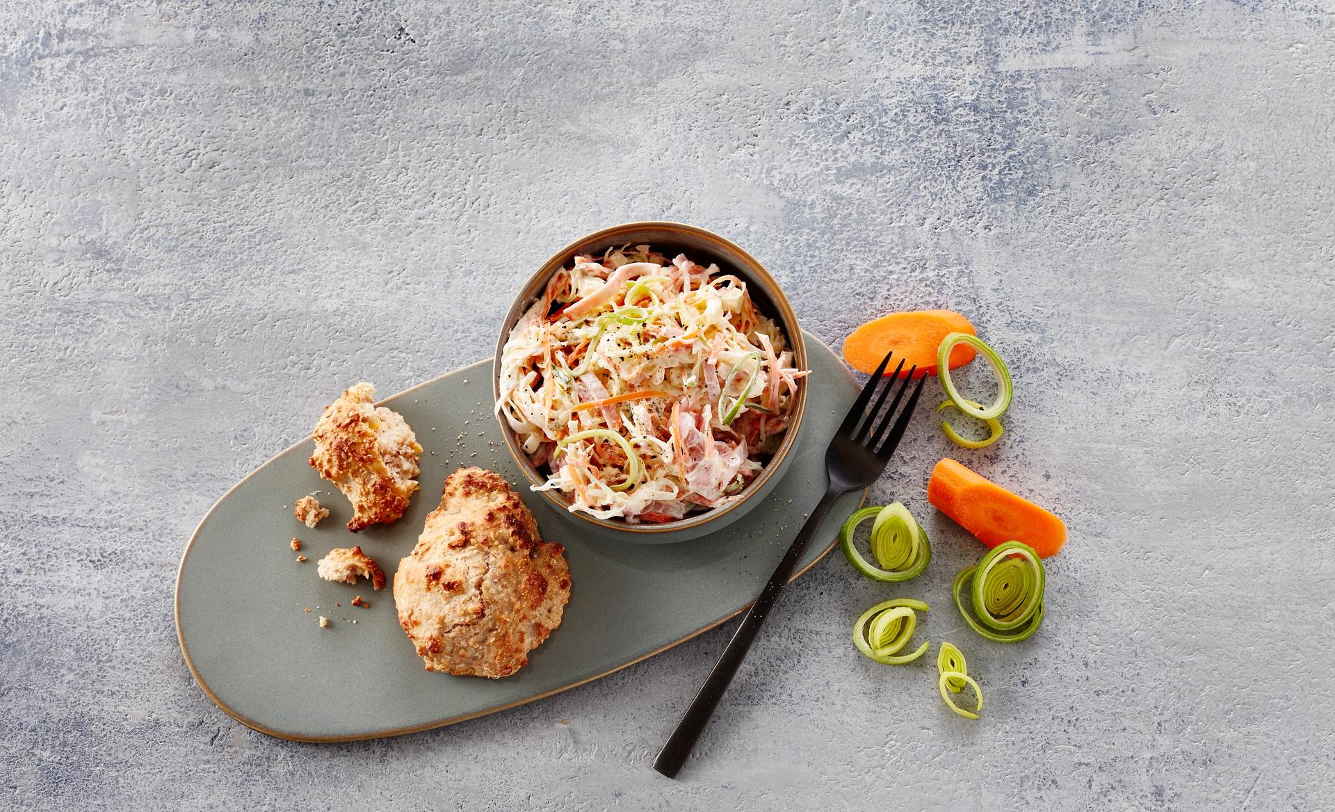 - Skrell gulrot, eple og løk. Finsnitt hodekål, riv gulrot og finhakk eple og løk eller purre. Strimle skinken.