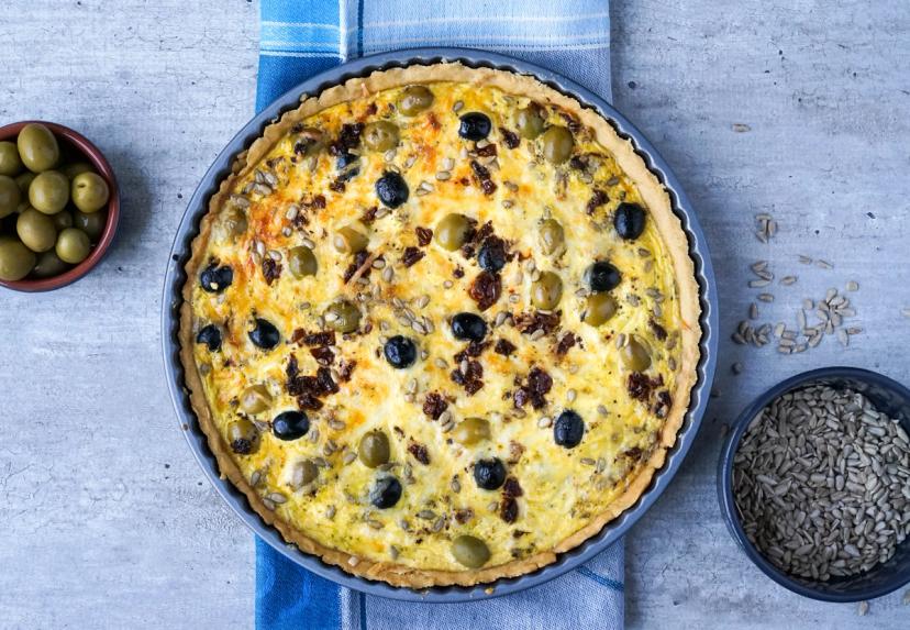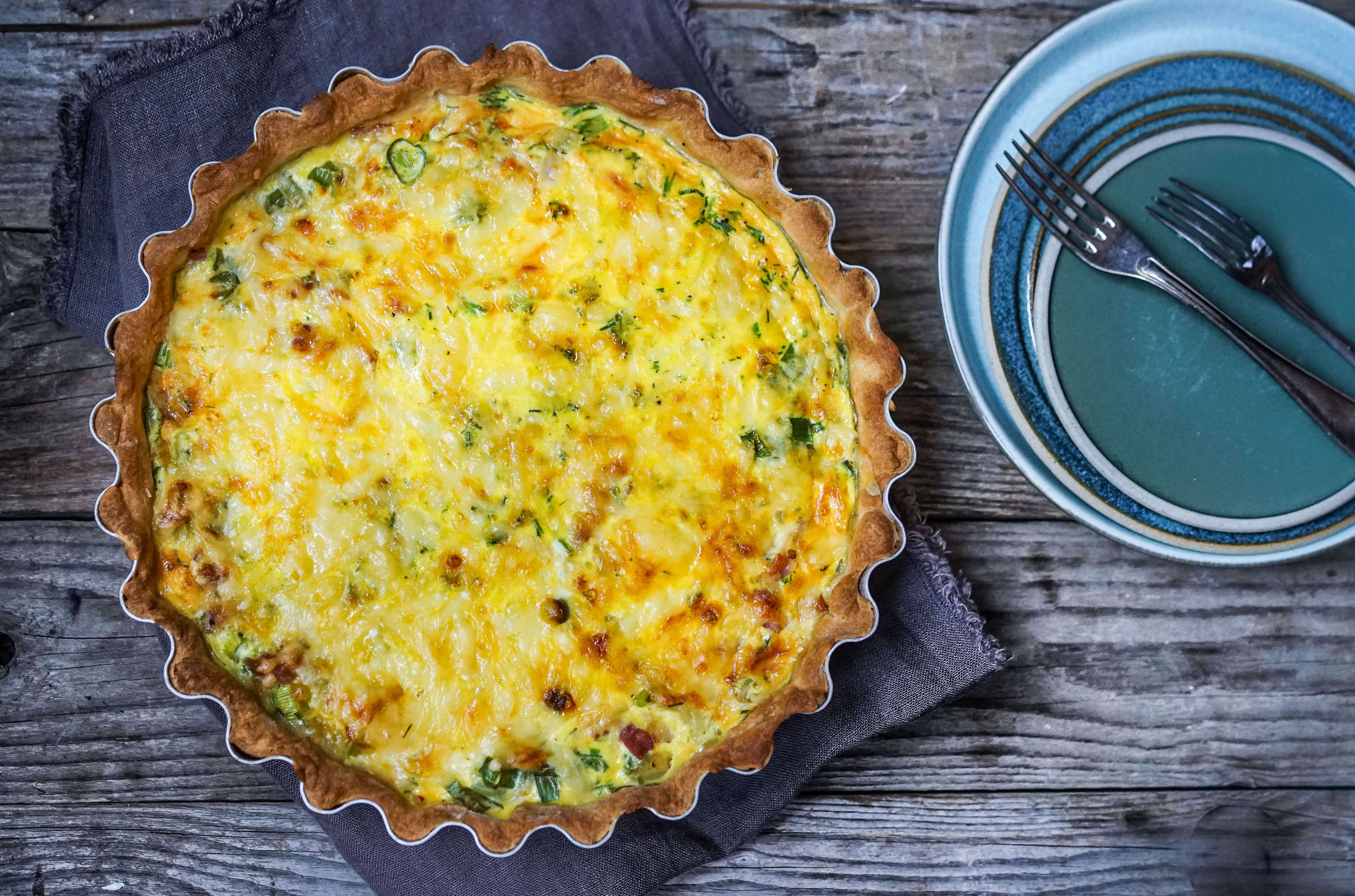 - Fordel løk, baconbiter og vårløk i det forstekte paiskallet. Dryss osten over og hell over eggeblandingen. Stek paien videre til eggeblandingen er stivnet ved 180 °C i ca 20 minutter.