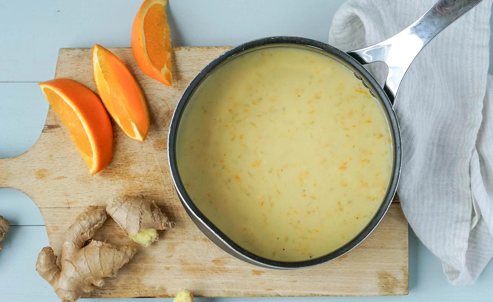 - Smelt smøret i en kjele ved middels varme. Tilsett revet skall av en appelsin, revet ingefær og selleri. La det hele surre på middels varme i 5 minutter til sellerien mykner.