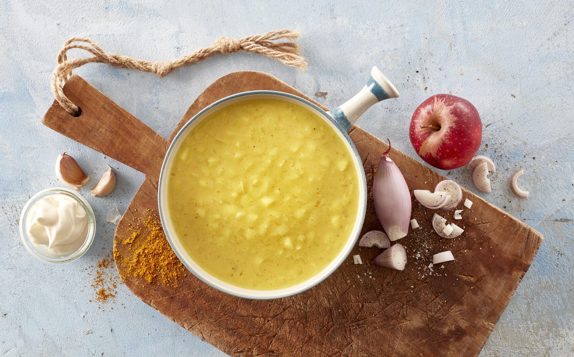 - Smelt smøret i en kjele ved middels varme. Tilsett eple, løk, hvitløk og karri i kjelen og la det hele surre på middels varme i noen minutter til løken og eplet har myknet.